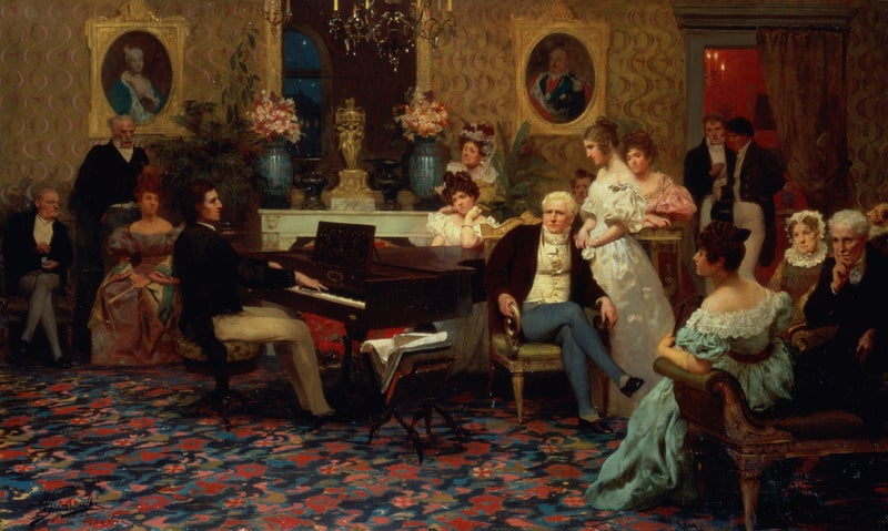 「ラジーヴィウ公爵邸のサロンで演奏するショパン」(H.シェミラズキ油絵1887年)